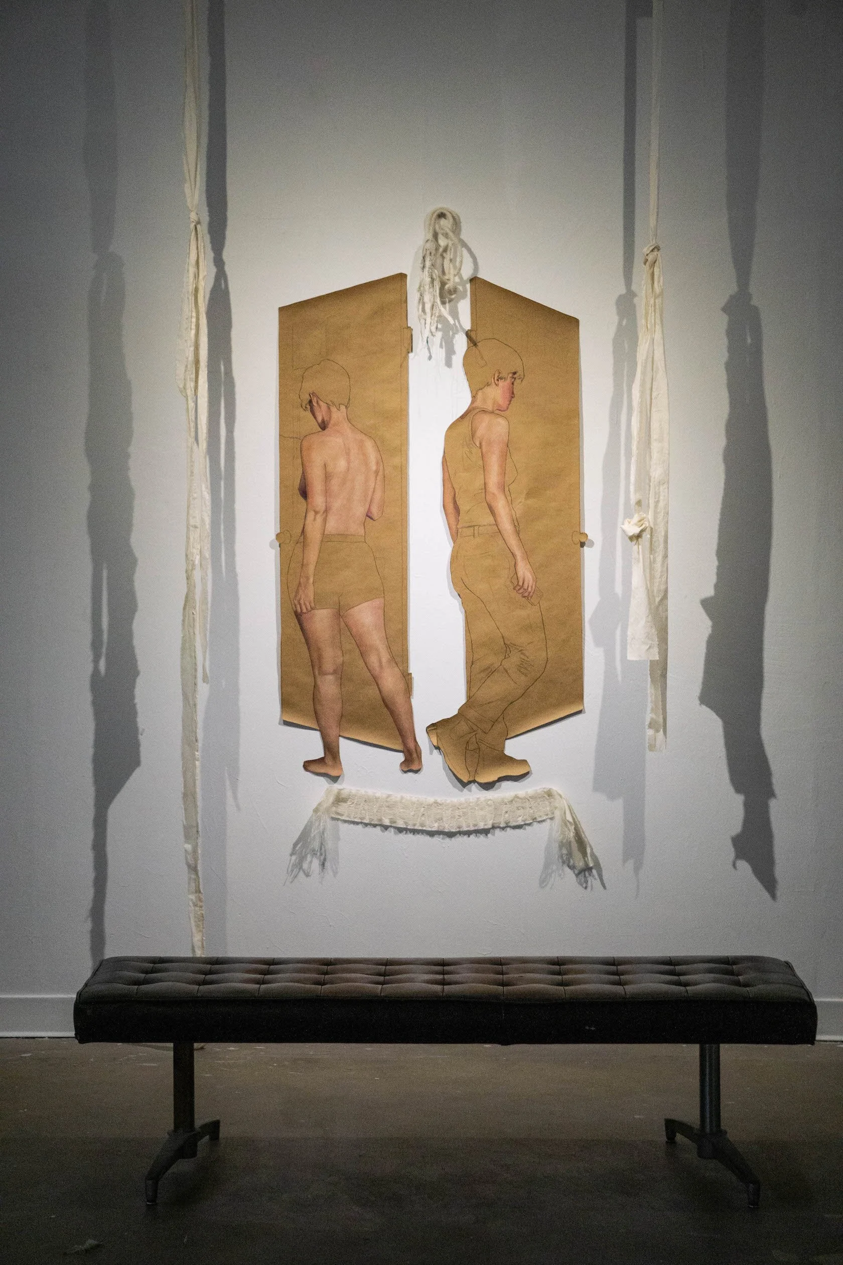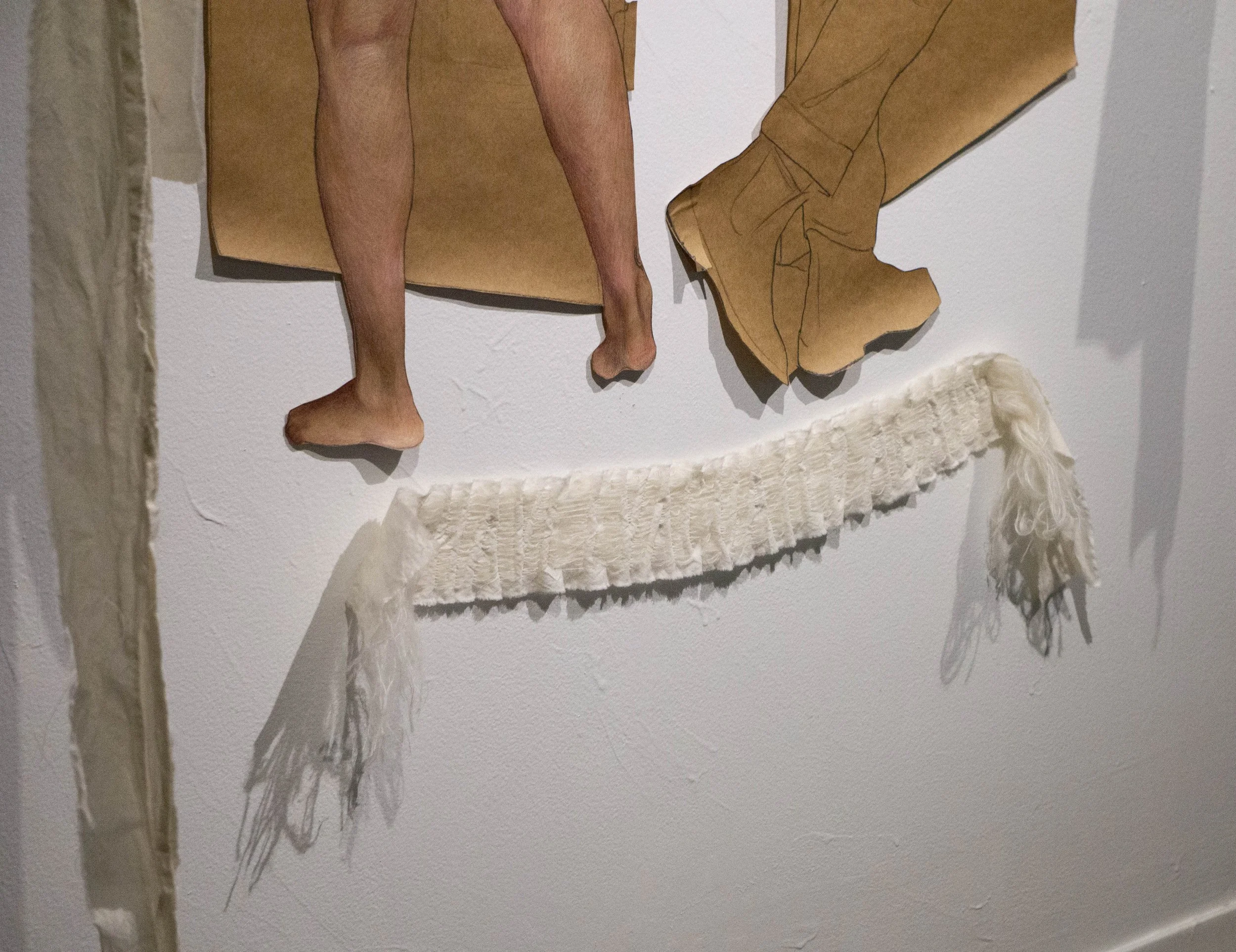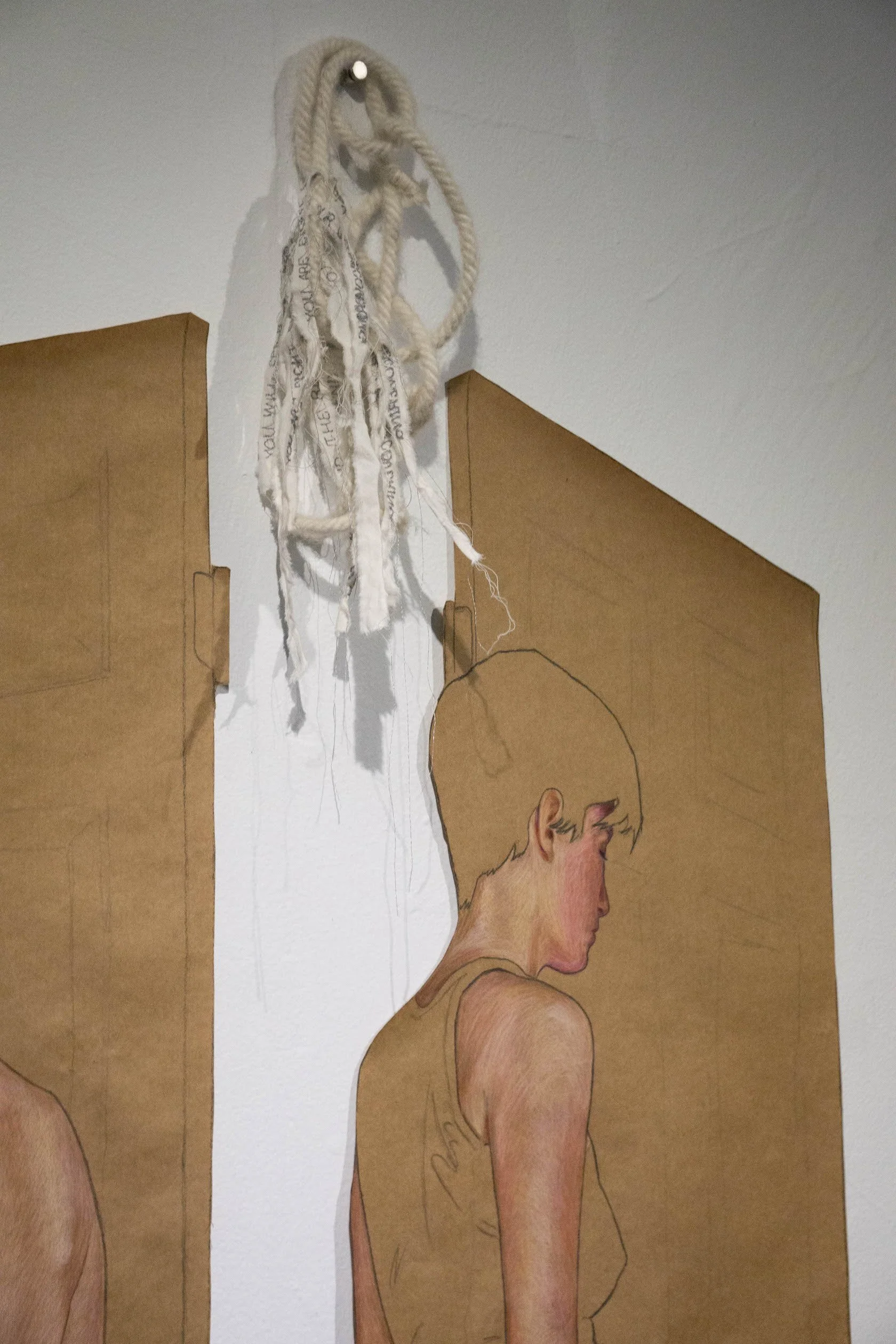 Colored pencil on butcher paper, machine embroidery, hand embroidery, hand-crafted rope, torn bed sheets
